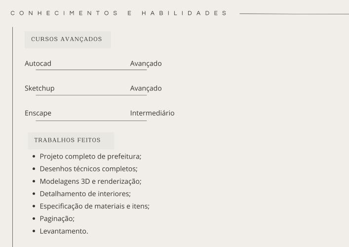 - Organização de espaços internos de construções em São José do Rio Preto (São Paulo), definindo os detalhes, as cores, o acabamento dos ambientes e os materiais de revestimento e iluminação.