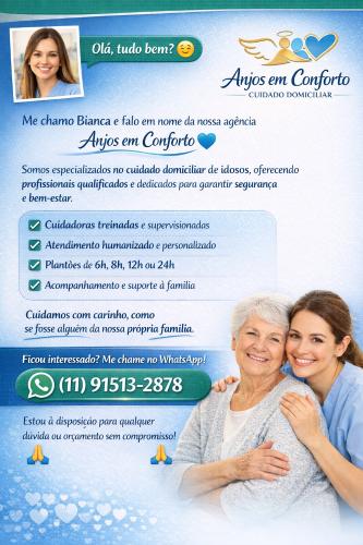 Agencia anjos em conforto é uma agencia que fornece para os familiares do idoso uma tranquilidade em cuidados com seu ente querido. Temos plantoes e trabalhamos somente com banhos tambem. Estamos a procura de profissionais que realmente ama o que faz.