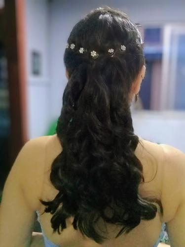 Sou morena cabelo encaracolado. Preciso de maquiagem e penteado com cabelo parte preso e parte solto realçando os cachos.