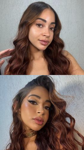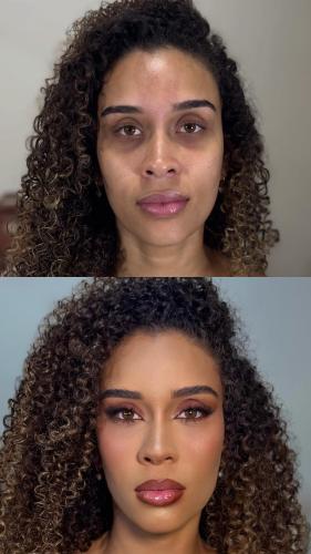 Serei madrinha de um casamento com cerimônia às 16:30h. A recepção irá até 00h. Gosto de maquiagem com os olhos marcados, bem chamativos, com delineado, cílios e brilho, eles são grandes e dá pra explorar bastante. Também gosto de batom vermelho e rosa, tons nudes deixam meus dentes mais amarelados. Meu cabelo é cacheado com a raiz lisa, quero um penteado meio solto meio preso, usando meu...