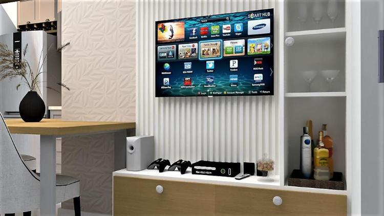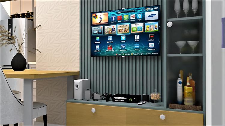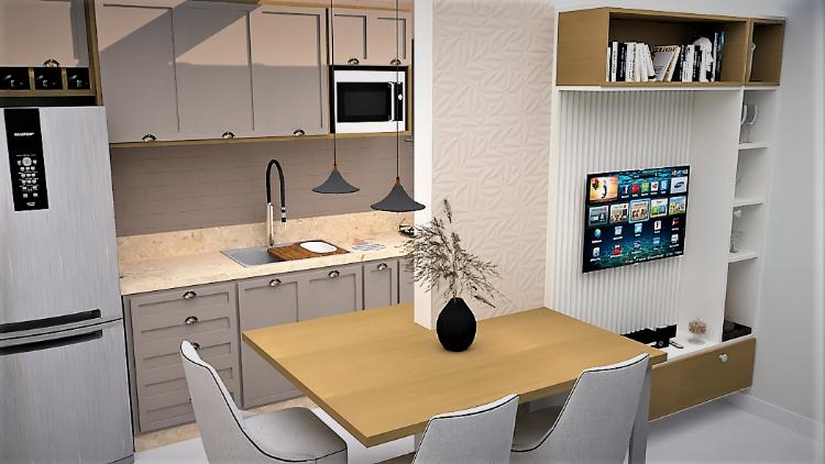 Apto de 70m² e 2dts. O projeto envolve a reativação de uma lavabo na área de serviço, modernização e a criação de um home office na sala de estar.